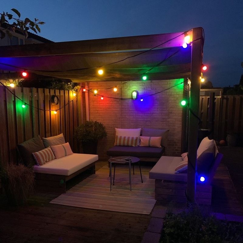 This string light is linkable with all our string lights. The length of the cable before the first fitting and after the last fitting is half the length of the cable between 2 fittings. By linking the string lights, you have exactly the same length between the fittings. Linking through is possible with simple and waterproof screw connectors.