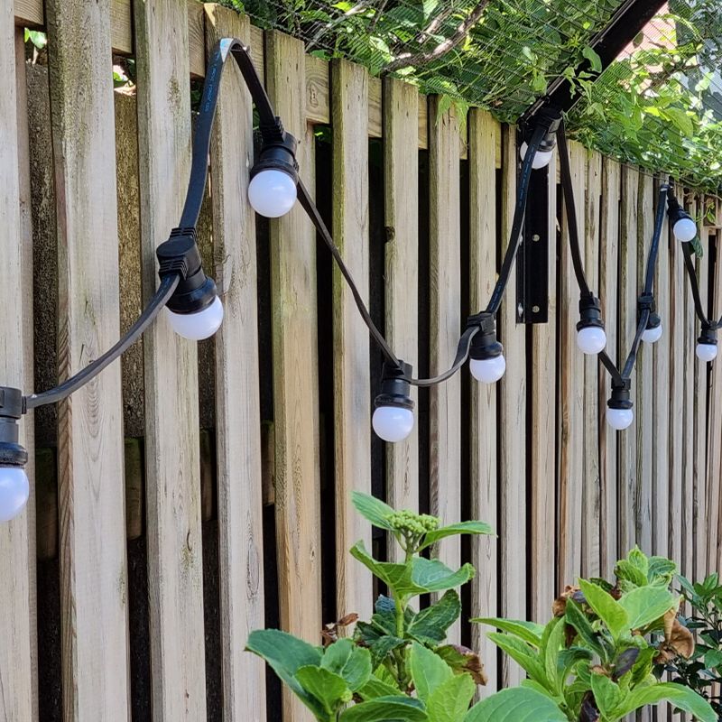 This string light is linkable with all our string lights. The length of the cable before the first fitting and after the last fitting is half the length of the cable between 2 fittings. By linking the string lights, you have exactly the same length between the fittings. Linking through is possible with simple and waterproof screw connectors.