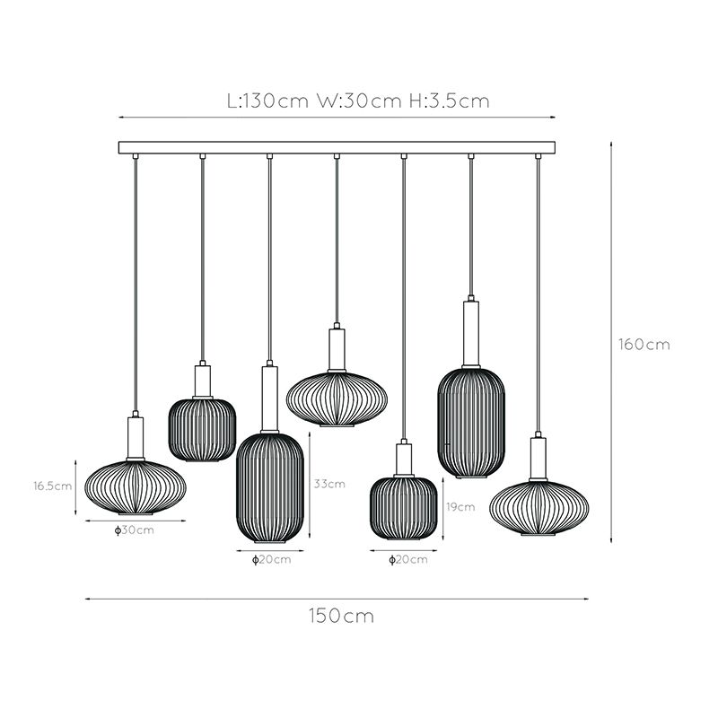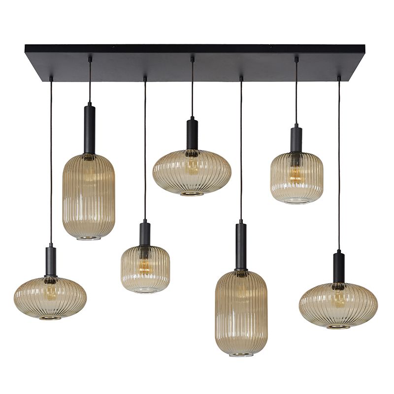 Product information Maximum wattage 40 Supply voltage 220-240V Number of lights 7 Lampholder type E27 Product information Light included No Width in cm 30 Weight in KG 11.5 Height in cm 150 Cable length 130 Length in cm 130 Dimmable Yes (not included) Warranty 2 years IP classification IP20 (dustproof) Colour Black, Amber Material Metal, Glass Area Living room, Bedroom, Hall Style Retro Article number Q34182