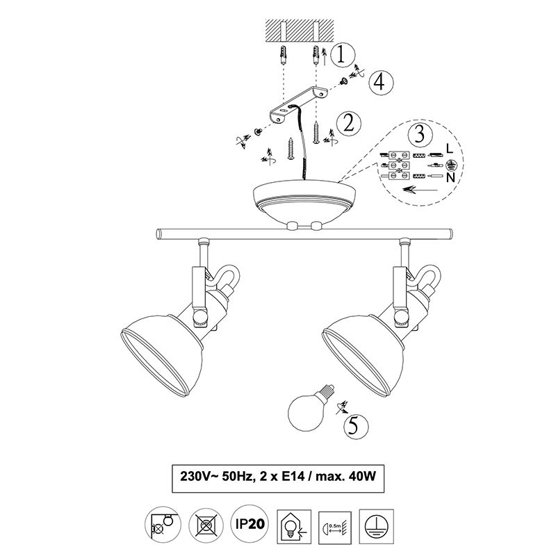 Product information Maximum wattage 40 Supply voltage 220-240V Number of lights 2 Lampholder type E14 Product information Light included No Width in cm 36.5 Weight in KG 0.73 Height in cm 25.5 Length in cm 13 Dimmable Yes (not included) Warranty 2 years IP classification IP20 (dustproof) Colour Black Material Metal With switch No With cord and plug No Style Industrial Article number Q14248 - Home