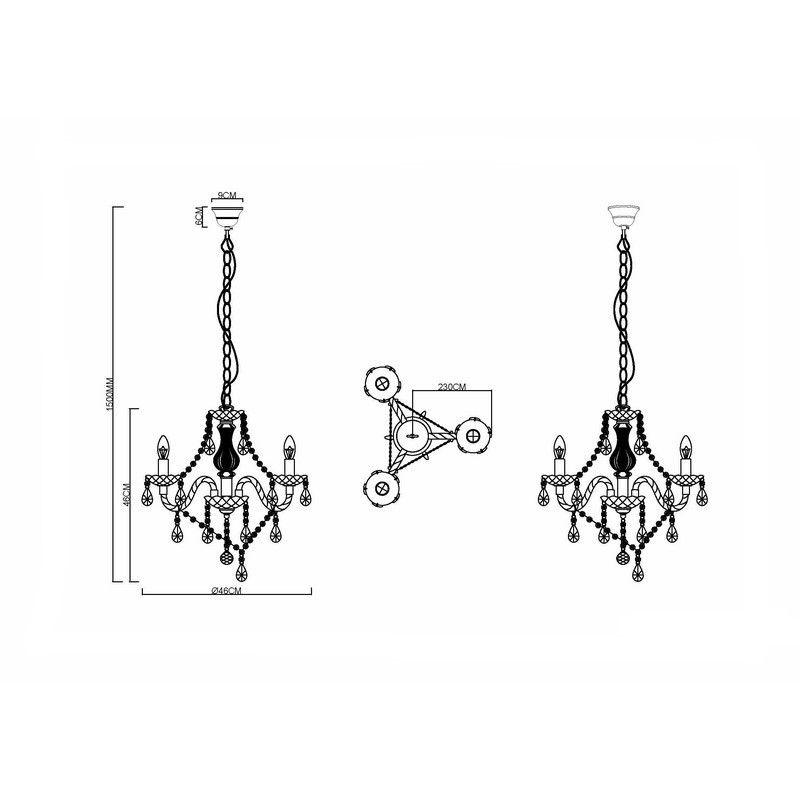 Product information Maximum wattage 40 Supply voltage 220-240V Number of lights 3 Lampholder type E14 Product information Light included No Width in cm 46 Diameter in cm 46 Weight in KG 1.69 Height in cm 150 Dimmable Yes (not included) Warranty 2 years IP classification IP20 (dustproof) Colour Black Material Plastic With switch No With cord and plug No Area Living room, Bedroom Style Classic Article number Q13243