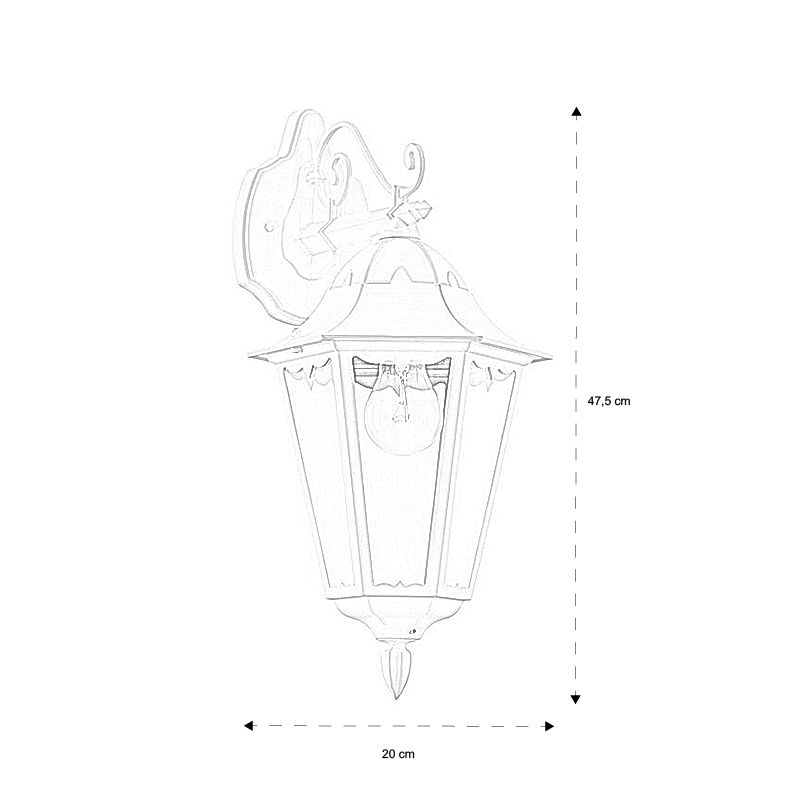 Product information Maximum wattage 60 Supply voltage 220-240V Number of lights 1 Lampholder type E27 Product information Light included No Depth in cm 28.5 Weight in KG 1.8 Height in cm 47.5 Length in cm 20 Dimmable Yes (not included) Warranty 2 years IP classification IP44 (water proof) Colour Silver, Black Material Aluminium, Glass With switch No Style Classic Article number Q16037 - Home
