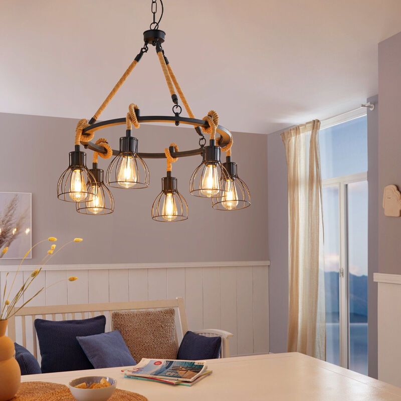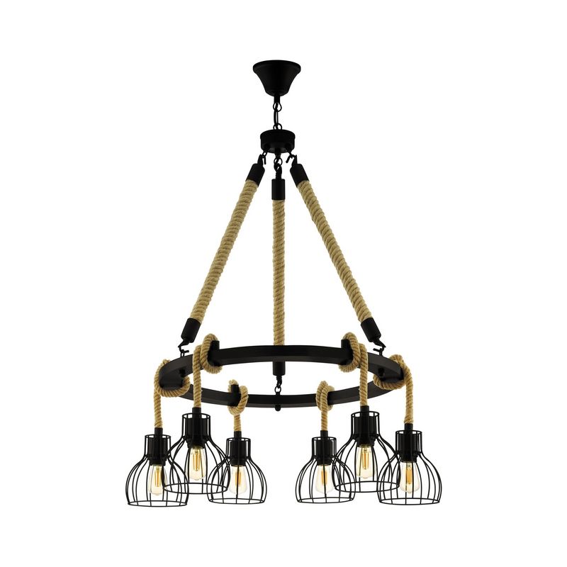 Product information Maximum wattage 28 Supply voltage 220-240V Number of lights 6 Lampholder type E27 Product information Light included No Width in cm 76 Diameter in cm 76 Weight in KG 6.133 Height in cm 109 Dimmable Yes (not included) Warranty 2 years IP classification IP20 (dustproof) Colour Black Material Steel, Rope Style Industrial Article number Q31116 - Home