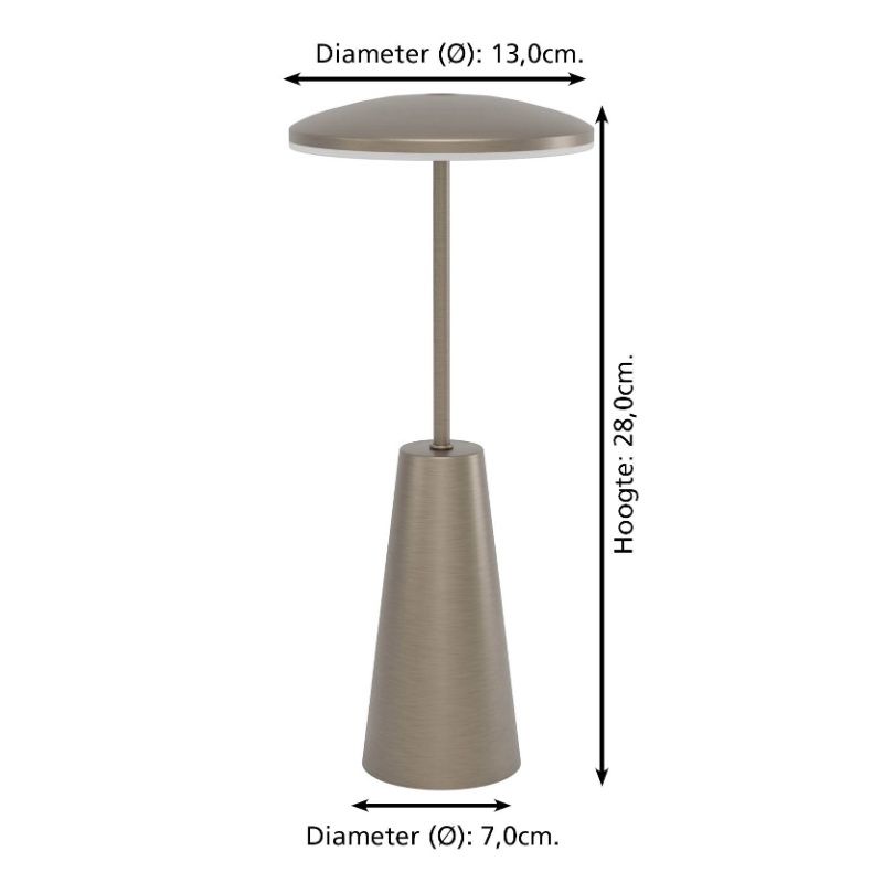 Product information Maximum wattage 2.8 Supply voltage 220-240V Number of lights 1 Number of Lumens 270 Product information Light colour White switch Lampholder type LED integrated Lightsource type included Integrated LED Expected burning hours 15000 Light included Yes, integrated Width in cm 13 Diameter in cm 13 Height in cm 28 Length in cm 13 Dimmable Yes (included) Warranty 2 years IP classification IP54 (water proof) Colour Bronze, White Material Plastic, Steel With switch Yes Style Modern Switch type On/off switch on the product Article number Q21339 - Home