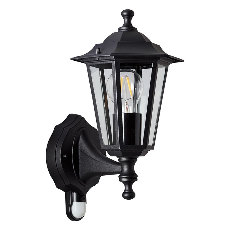 Product information Maximum wattage 60 Supply voltage 220-240V Number of lights 1 Lampholder type E27 Product information Light included No Width in cm 16.5 Weight in KG 1.192 Height in cm 37.5 Length in cm 21.5 Dimmable Yes (not included) Warranty 2 years IP classification IP44 (water proof) Colour Black Material Aluminium, Glass With switch Yes Style Classic Switch type Motion sensor Article number Q32563 - Home