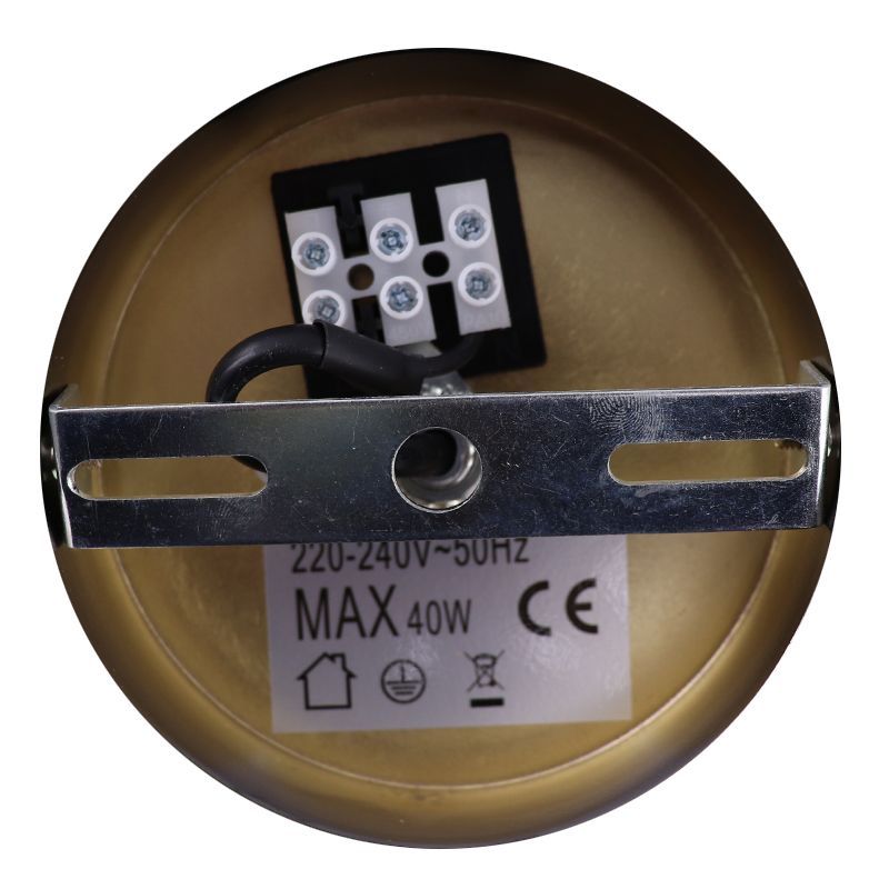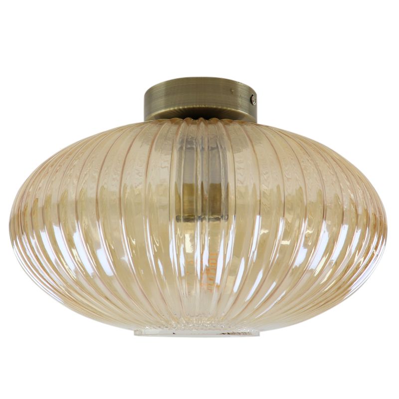 Product information Maximum wattage 25 Supply voltage 220-240V Number of lights 1 Lampholder type E27 Product information Light included No Width in cm 30 Diameter in cm 30 Height in cm 21 Dimmable Yes (not included) Warranty 2 years IP classification IP20 (dustproof) Colour Gold, Amber Material Metal, Glass Style Design Article number Q28387 - Home