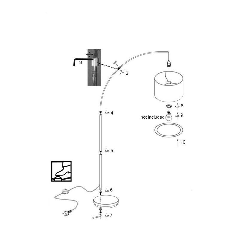 Product information Maximum wattage 60 Supply voltage 220-240V Number of lights 1 Lampholder type E27 Product information Light included No Width in cm 36 Diameter in cm 36 Weight in KG 9.495 Height in cm 180 Length in cm 113 Dimmable Yes (not included) Warranty 2 years IP classification IP20 (dustproof) Colour Chrome, White Material Metal, Fabric With switch Yes With cord and plug Yes Area Living room, Bedroom Style Basic Switch type On/off switch on the cord Article number Q10814 - Home