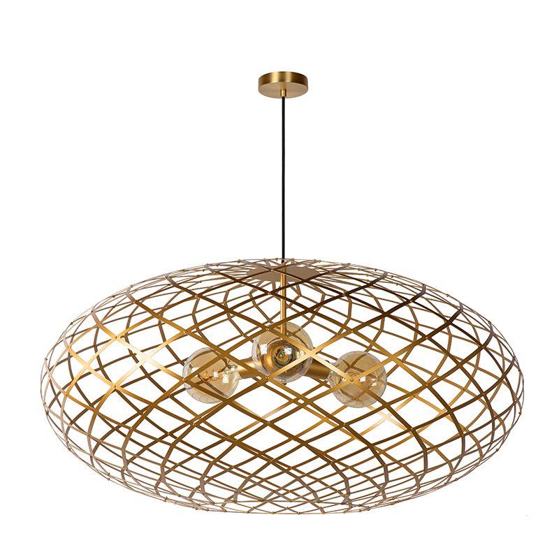 The golden pendant light Wolfram has the style modern and is made of metal. This modern pendant light has 3 E27 lamp holders and is supplied excluding 3 light sources. The lamp can accommodate light sources with a maximum power of 60 watts per bulb.