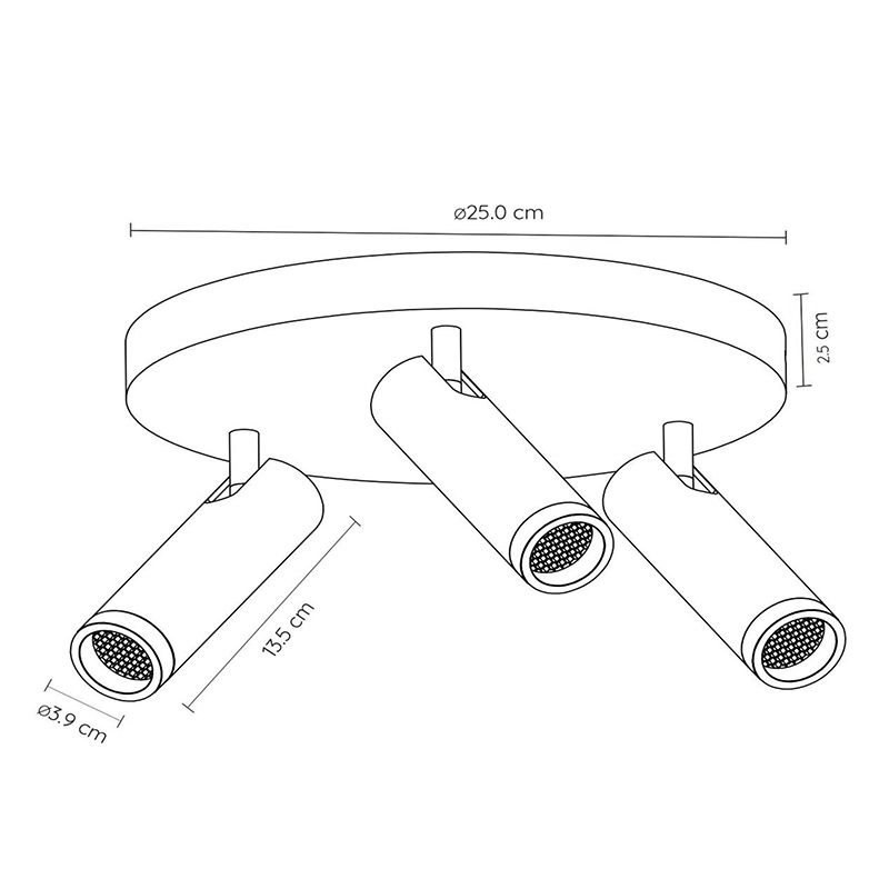 Product information Maximum wattage 12 Supply voltage 220-240V Number of lights 3 Lampholder type GU10 (MR11) Product information Light included No Width in cm 25 Diameter in cm 25 Weight in KG 1 Height in cm 23 Length in cm 10 Dimmable Yes (not included) Warranty 2 years IP classification IP20 (dustproof) Colour Grey Material Aluminium Style Modern Article number Q39383 - Home