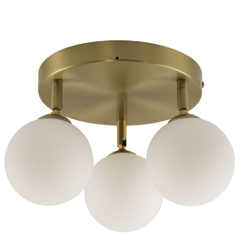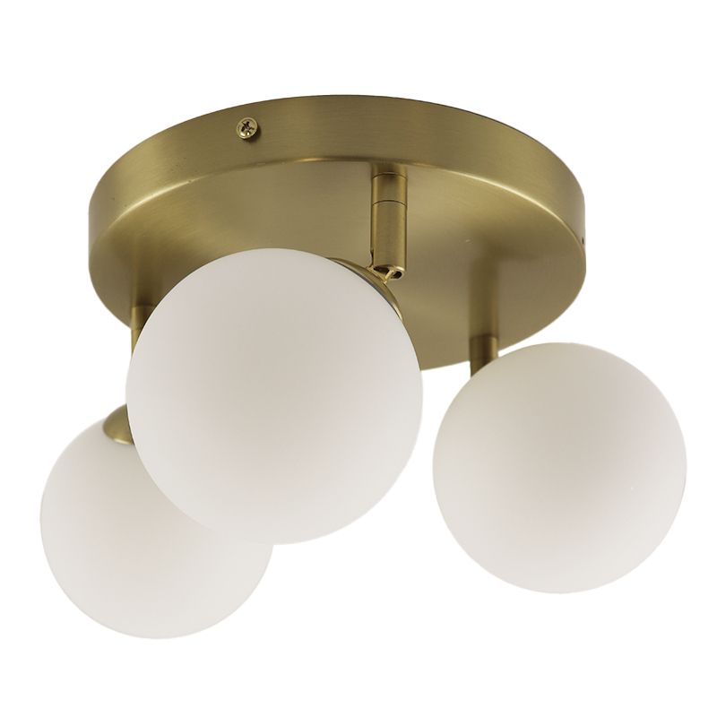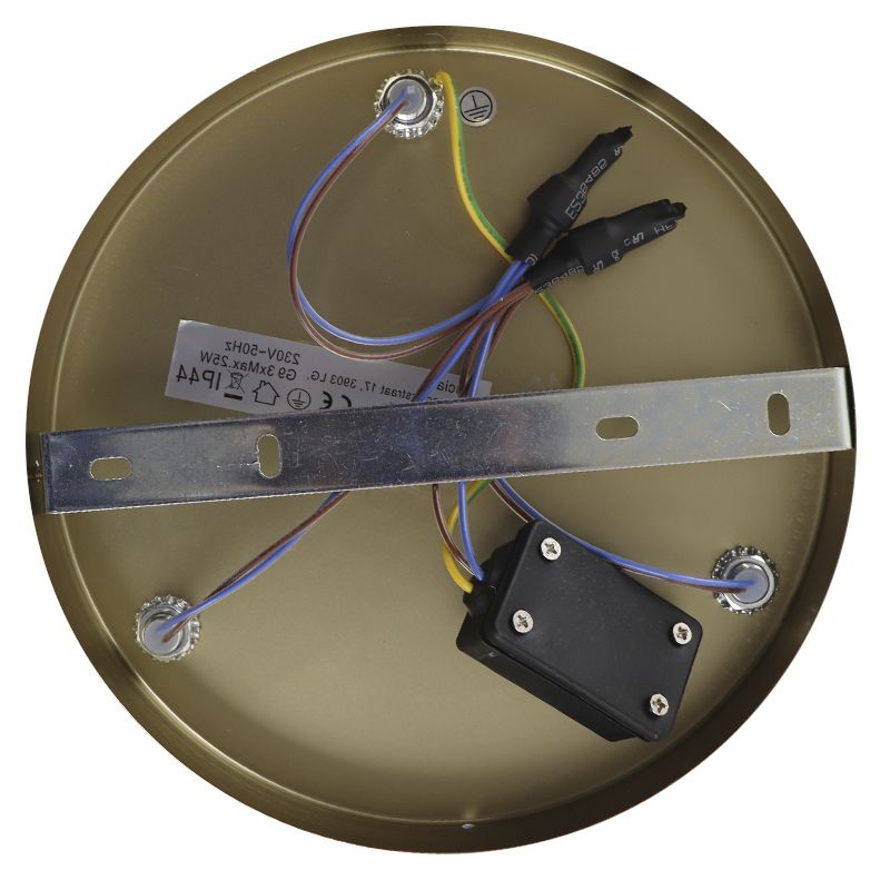 Product information Maximum wattage 25 Supply voltage 220-240V Number of lights 3 Lampholder type G9 Product information Light included No Width in cm 27 Width base/mounting plate 20 Diameter in cm 27 Diameter base/mounting plate 20 Height in cm 18 Height base/mounting plate 2.5 Length in cm 27 Length base/mounting plate 20 Dimmable Yes (not included) Warranty 2 years IP classification IP44 (water proof) Colour Brass, White Material Aluminium, Glass Area Bathroom Style Modern Article number Q79516 - Home