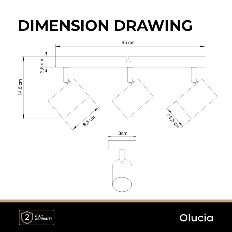 Product information Maximum wattage 35 Supply voltage 220-240V Number of lights 3 Lampholder type GU10 Product information Light included No Width in cm 8 Width base/mounting plate 8 Height in cm 14.7 Height base/mounting plate 2.5 Length in cm 35 Length base/mounting plate 35 Dimmable Yes (not included) Warranty 2 years IP classification IP20 (dustproof) Colour Bronze Material Metal Style Modern Article number Q24409 - Home