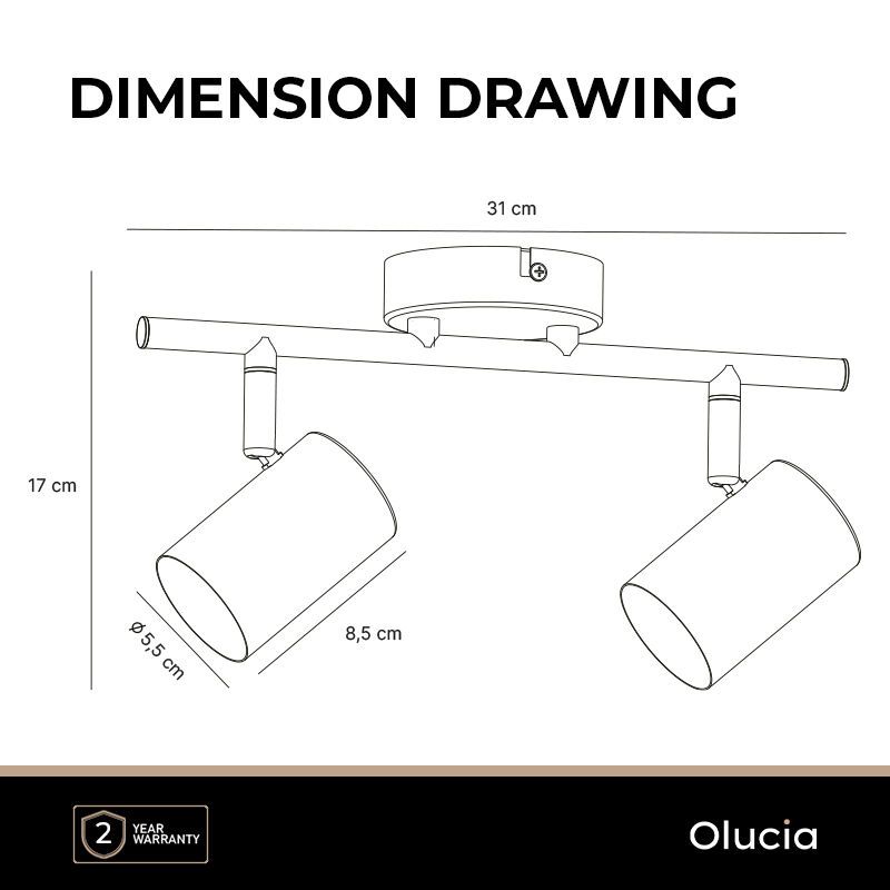 Product information Maximum wattage 35 Supply voltage 220-240V Number of lights 2 Lampholder type GU10 Product information Light included No Width in cm 9 Width base/mounting plate 9 Height in cm 17 Height base/mounting plate 2.5 Length in cm 30.3 Length base/mounting plate 9 Dimmable Yes (not included) Warranty 2 years IP classification IP20 (dustproof) Colour White Material Metal Style Modern Article number Q79597 - Home