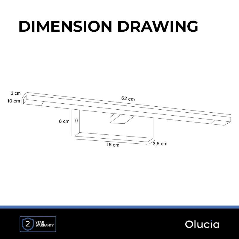 Product information Maximum wattage 8 Supply voltage 220-240V Energy label E Number of lights 1 Product information Number of Lumens 450 Light colour 3000K (Warm white) Lampholder type LED integrated Lightsource type included Integrated LED Expected burning hours 15000 Light included Yes, integrated Width in cm 5.5 Width base/mounting plate 5.5 Height in cm 62 Height base/mounting plate 3.2 Length in cm 16 Length base/mounting plate 15.5 Dimmable No Warranty 2 years IP classification IP44 (water proof) Colour White Material Plastic, Aluminium Area Bathroom Style Modern Article number Q52363