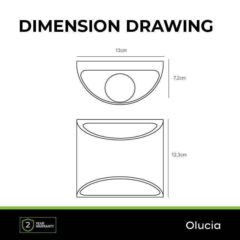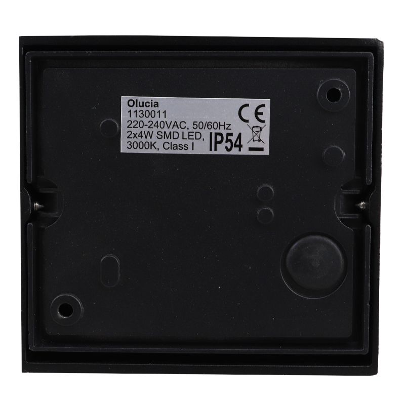 Product information Maximum wattage 8 Supply voltage 220-240V Energy label F Number of lights 1 Product information Number of Lumens 600 Light colour 3000K (Warm white) Lampholder type LED integrated Lightsource type included Integrated LED Expected burning hours 15000 Light included Yes, integrated Width in cm 13 Height in cm 12.3 Length in cm 7 Dimmable No Warranty 2 years IP classification IP54 (water proof) Colour Black Material Aluminium Style Modern Article number Q36353 - Home