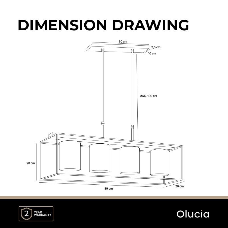 Product information Maximum wattage 40 Supply voltage 220-240V Number of lights 4 Lampholder type E27 Product information Light included No Width in cm 20 Width base/mounting plate 10 Height in cm 130 Height base/mounting plate 2.5 Length in cm 90 Length base/mounting plate 30 Dimmable Yes (not included) Warranty 2 years IP classification IP20 (dustproof) Colour Black Material Aluminium, Glass Style Modern Article number Q51913 - Home