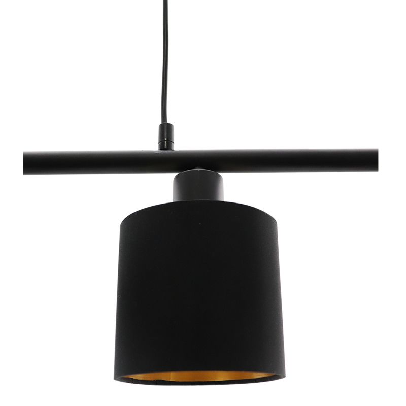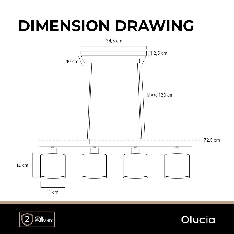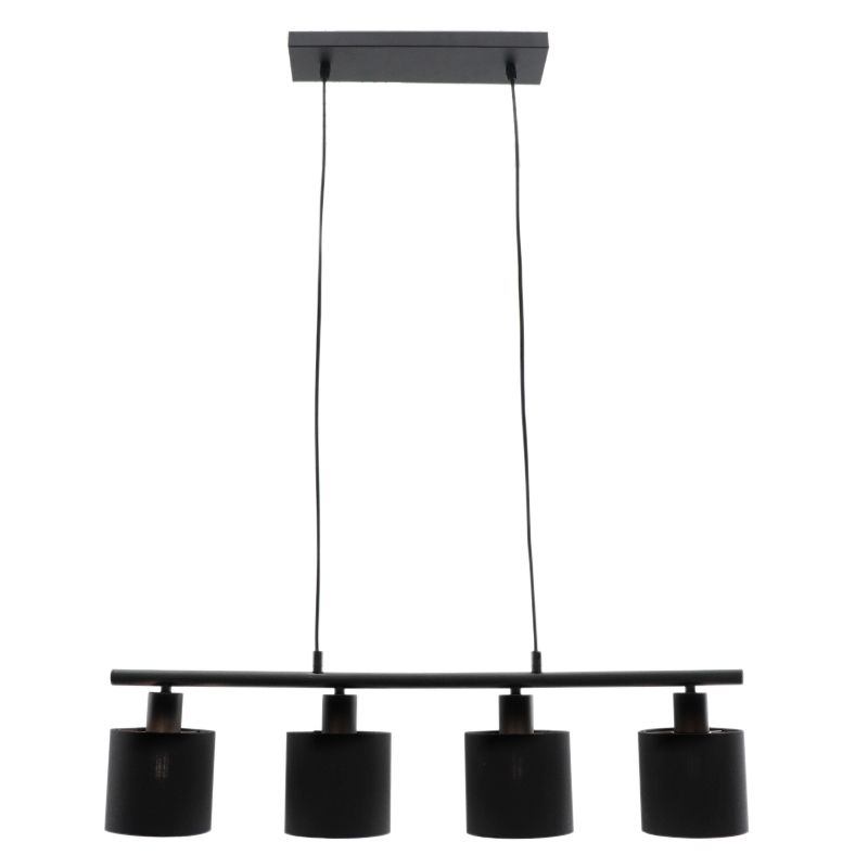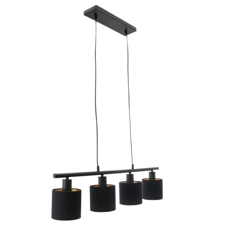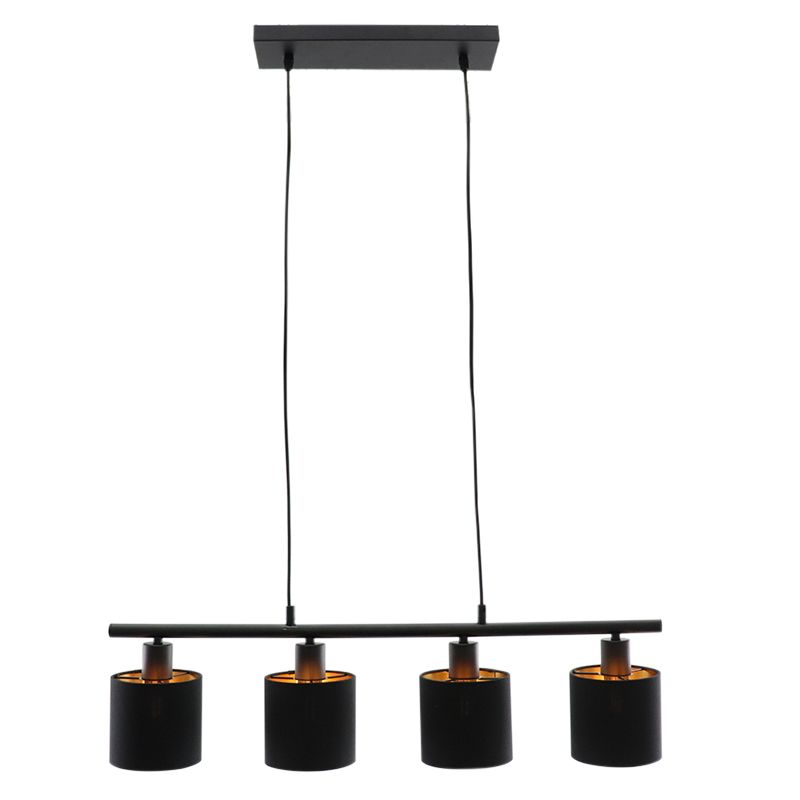 Product information Maximum wattage 25 Supply voltage 220-240V Number of lights 4 Lampholder type E14 Product information Light included No Width in cm 72 Width base/mounting plate 10 Height in cm 120 Height base/mounting plate 2.5 Length base/mounting plate 34.5 Dimmable Yes (not included) Warranty 2 years IP classification IP20 (dustproof) Colour Gold, Black Material Fabric, Aluminium Area Dining table Style Modern Article number Q29278 - Home