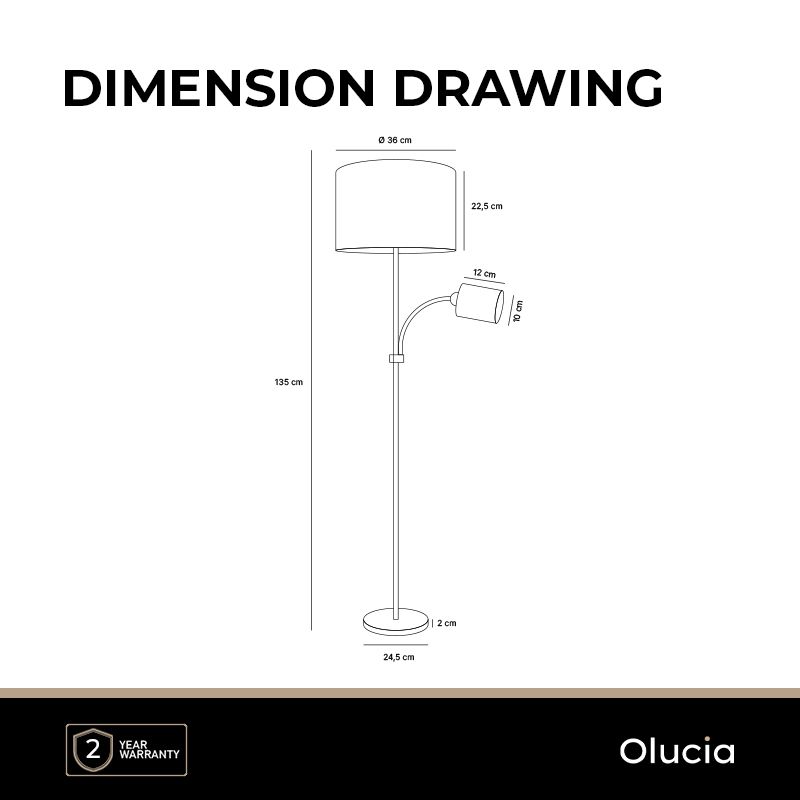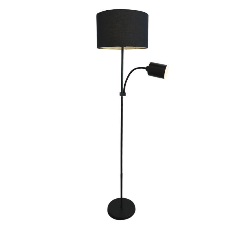 The modern reading floor lamp Zev has the colour black and is made of fabric. The black reading floor lamp is supplied without light sources. This lamp requires 1 light source with E27 lamp holder and 1 light source with E14 lamp holder. The maximum wattage of the light sources must not exceed 40 watts per bulb.