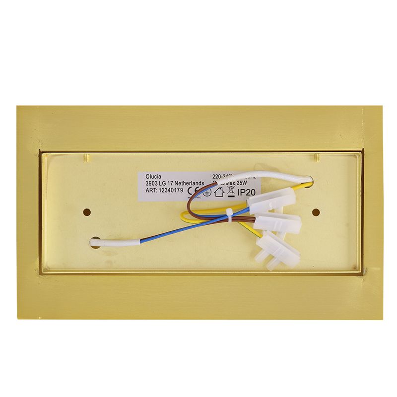Product information Maximum wattage 25 Supply voltage 220-240V Number of lights 2 Lampholder type G9 Product information Light included No Width in cm 5 Width base/mounting plate 20.8 Diameter in cm 24 Height in cm 14 Height base/mounting plate 8 Length in cm 24 Length base/mounting plate 1.5 Dimmable Yes (not included) Warranty 2 years IP classification IP20 (dustproof) Colour Brass Material Aluminium Style Modern Article number Q18609 - Home