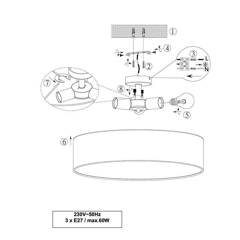 Product information Maximum wattage 60 Supply voltage 220-240V Number of lights 3 Lampholder type E27 Product information Light included No Width in cm 50 Diameter in cm 50 Weight in KG 1.26 Height in cm 17 Dimmable Yes (not included) Warranty 2 years IP classification IP20 (dustproof) Colour Nickel Material Metal, Fabric With switch No With cord and plug No Area Bedroom, Store Style Basic Article number Q12801 - Home