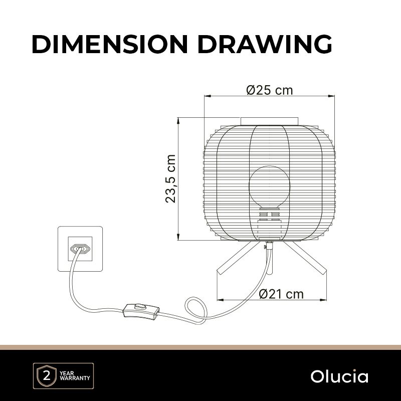 Product information Maximum wattage 7 Supply voltage 220-240V Number of lights 1 Lampholder type E27 Product information Light included No Width in cm 25 Diameter in cm 25 Height in cm 30 Length in cm 25 Dimmable Yes (not included) Warranty 2 years IP classification IP20 (dustproof) Colour Brown, Black Material Metal, Rattan With switch Yes With cord and plug Yes Style Rustic Switch type On/off switch on the cord Article number Q11963 - Home