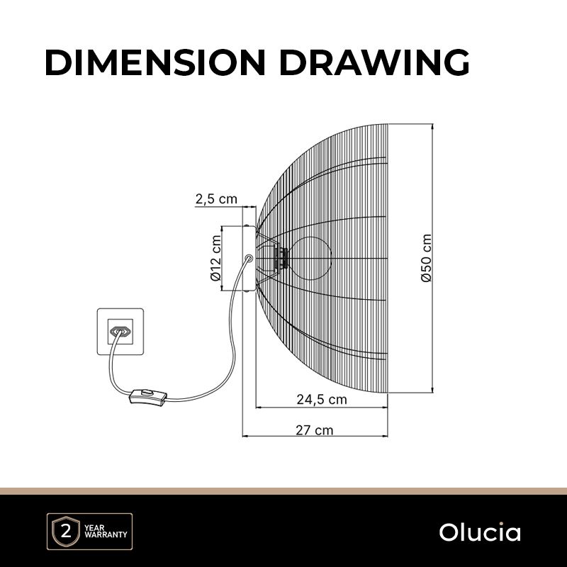 Product information Maximum wattage 7 Supply voltage 220-240V Number of lights 1 Lampholder type E27 Product information Light included No Width in cm 27 Width base/mounting plate 12 Diameter in cm 50 Height in cm 50 Height base/mounting plate 2.5 Length in cm 50 Length base/mounting plate 12 Dimmable Yes (not included) Warranty 2 years IP classification IP20 (dustproof) Colour Brown, Black Material Metal, Rattan With switch Yes With cord and plug Yes Style Rustic Switch type On/off switch on the cord Article number Q11962 - Home