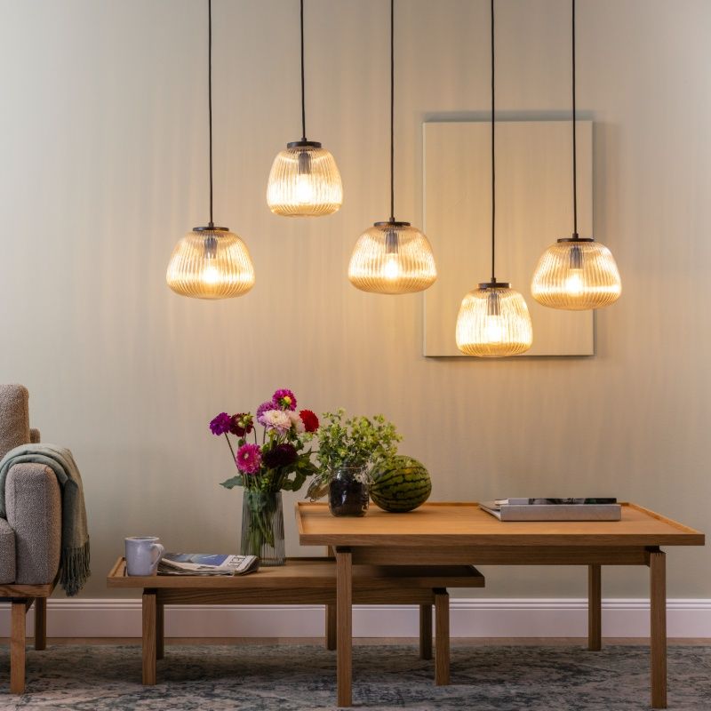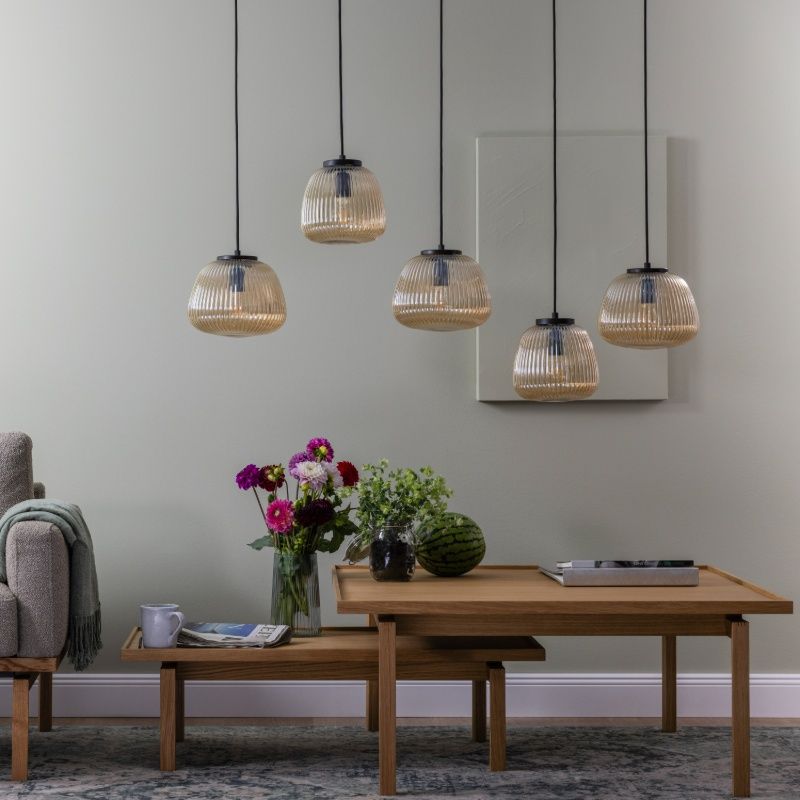 Product information Maximum wattage 40 Supply voltage 220-240V Number of lights 5 Lampholder type E27 Product information Light included No Width in cm 47.5 Depth in cm 125 Height in cm 150 Cable length 123 Dimmable Yes (not included) Warranty 2 years IP classification IP20 (dustproof) Colour Black, Amber Material Metal, Glass Style Retro Article number Q27678 - Home