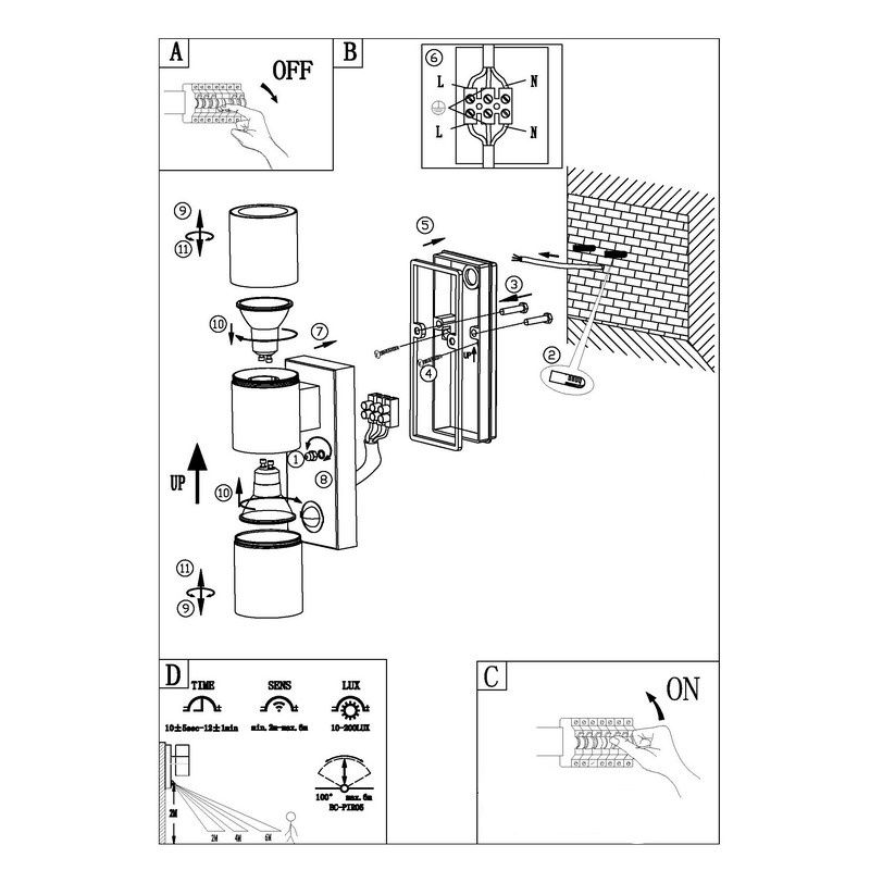 Product information Maximum wattage 3 Supply voltage 220-240V Energy label F Number of lights 2 Product information Number of Lumens 240 Light colour 3000K (Warm white) Lampholder type GU10 Lightsource type included LED interchangeable Expected burning hours 25000 Light included Yes Depth in cm 11 Weight in KG 0.9 Height in cm 21.5 Length in cm 6.5 Minimum height with lampshade 21.5 Dimmable No Warranty 2 years IP classification IP44 (water proof) Colour Silver Material Stainless steel With switch Yes Style Modern Switch type Motion sensor Article number Q15672 - Home