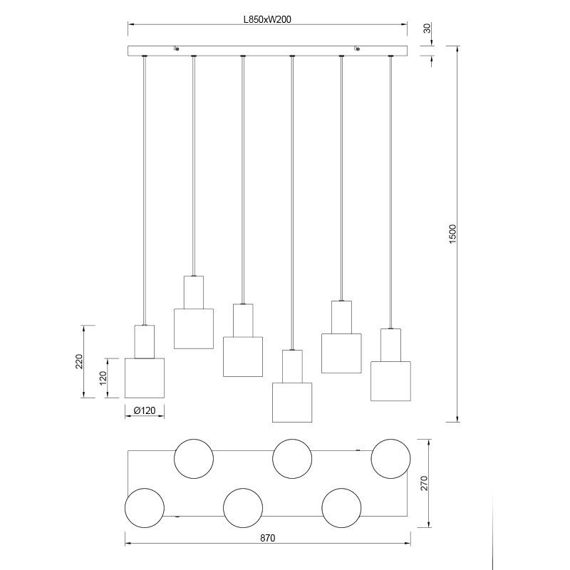 Product information Maximum wattage 40 Supply voltage 220-240V Number of lights 6 Lampholder type E27 Product information Light included No Width in cm 85 Diameter in cm 12 Height in cm 150 Length in cm 27 Dimmable Yes (not included) Warranty 2 years IP classification IP20 (dustproof) Colour Taupe Material Metal Style Modern Article number Q51256 - Home