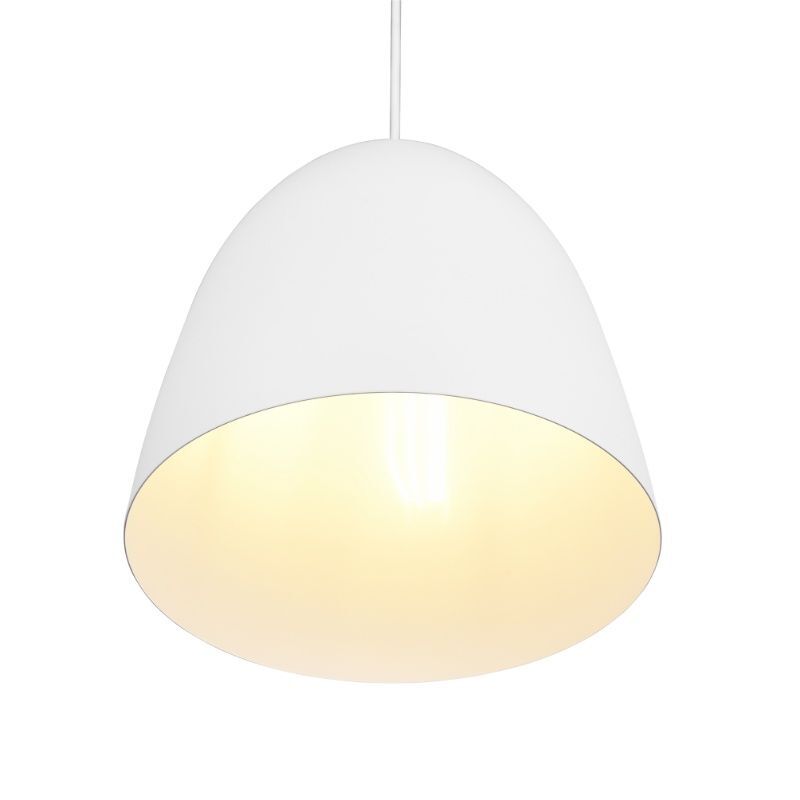 The white dome pendant light Ingmar has the style modern and is made of aluminium. This modern dome pendant light has a E27 lamp holder and is supplied without a light source. The lamp can accommodate light sources with a maximum power of 40 watts.