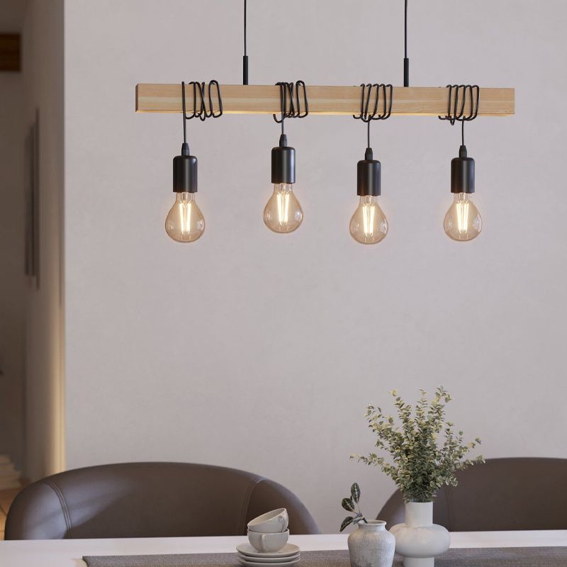 Product information Maximum wattage 40 Supply voltage 220-240V Number of lights 4 Lampholder type E27 Product information Light included No Width in cm 15 Width base/mounting plate 4.5 Weight in KG 2.83 Height in cm 110 Height base/mounting plate 4.5 Length in cm 70 Length base/mounting plate 40 Dimmable Yes (not included) Warranty 2 years IP classification IP20 (dustproof) Colour Black, Wood Material Wood, Steel Area Dining table Style Rustic Article number Q31432 - Home