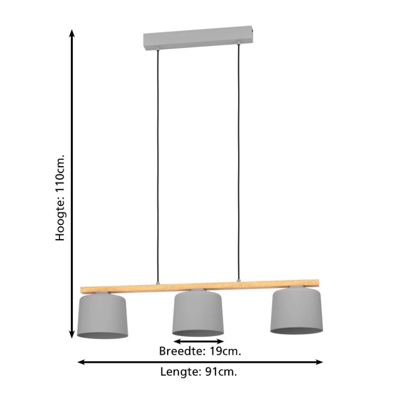Product information Maximum wattage 40 Supply voltage 220-240V Number of lights 3 Lampholder type E27 Product information Light included No Width in cm 19 Weight in KG 3.257 Height in cm 110 Length in cm 91 Dimmable Yes (not included) Warranty 2 years IP classification IP20 (dustproof) Colour Grey Material Wood, Aluminium Style Rustic Article number Q33825 - Home